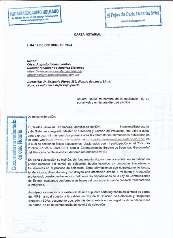 (americasistemas.com.pe. Lima, Perú – 23 de octubre 2024) El reciente conflicto en torno a la “Contratación del Servicio de Seguridad Gestionada” por parte del Ministerio de Relaciones Exteriores (MRE) ha generado un debate sobre la transparencia en los procesos de selección de proveedores. La semana pasada, nuestro medio, América Sistemas, fue objeto de una carta notarial firmada por Martha Jackeline Tito Hervias, miembro del comité de selección de dicho concurso público, quien exige que retiremos su nombre de la publicación relacionada y emitamos una disculpa pública por las afirmaciones realizadas en nuestro artículo titulado «Fraude a la vista: Ministerio de Relaciones Exteriores», publicado en la edición 1167 (picar aquí). A continuación, detallamos los hechos de controversia.