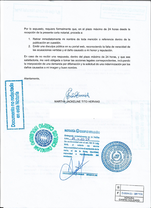 Carta notarial intimidatoria enviada por la Ing. Tito