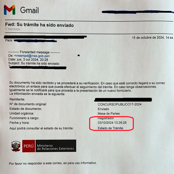 Contrario a lo que la ingeniera Tito argumenta en su misiva, nosotros mantenemos nuestra posición. La carta que alerta sobre los problemas técnicos en la solución EDR ingresó a la mesa de partes del Ministerio el 3 de octubre, como lo confirma el acuse de recibo electrónico que publicamos a continuación. Esto sugiere que las áreas dentro del Ministerio de Relaciones Exteriores están operando de manera descoordinada, algo preocupante en un proceso de tal envergadura.