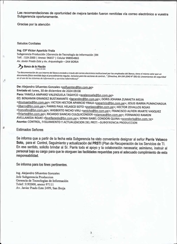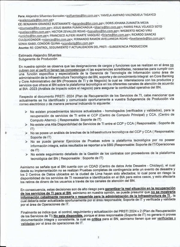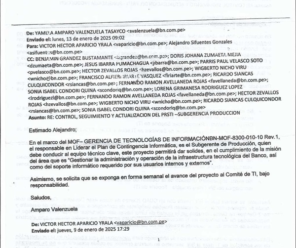 Según los correos electrónicos internos, las designaciones de cargos y funciones en el área de TI no cumplen con los perfiles necesarios. Se señala que los responsables carecen de las competencias y experiencias requeridas para gestionar una infraestructura tecnológica tan crítica como la del Banco de la Nación. Esto incluye la administración del Core Banking y Core Administrativo, esenciales para los procesos de negocio del banco.