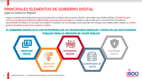 Víctor Vera Tudela, Socio de Consultoría de Negocios de BDO Perú, dijo que es necesario que los gobiernos puedan compartir información y así los ciudadanos puedan participar en las decisiones que se tomen. Así el gobierno digital debe tener información con datos abiertos para que se vea más transparente. Ante la pregunta ¿cuáles son los principales elementos del gobierno digital? Dijo que ello está conformado por identidad digital, en donde el ciudadano pueda ser identificado en todas las plataformas del sector público, servicios digitales o entidades públicas que brinden servicios que ya no requieran alguna atención física, sino que se diseñen desde un punto de vista digital por defecto. La operabilidad es muy importante para que el Estado no vuelva a pedir información al ciudadano, sino que éste debe tenerlo.