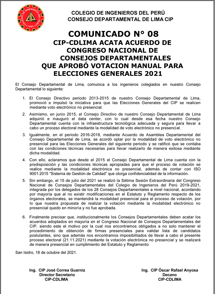 COMUNICADO N° 08 CIP-CDLIMA ACATA ACUERDO DE CONGRESO NACIONAL DE CONSEJOS DEPARTAMENTALES PARA APROBAR VOTACION MANUAL EN ELECCIONES GENERALES 2021