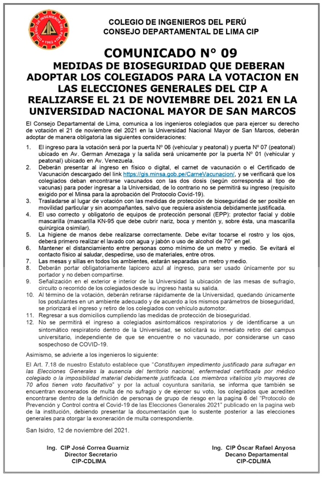 Todo lo que aparece en este “comunicado” es más que vergonzante. ¿Por qué se ha llevado y se sigue pretendiendo llevarnos a todos nosotros profesionales ingenieros a esta situación? ¿Quién va a ir a votar yendo hasta la san marcos? ¿Los que quieren evitar la multa de 80 soles o los que como carneritos serán llevados en custers o buses a votar por los interesados en ser autoridades del CIP para finalmente figuretear o querer robarse algo? POR FAVOR, un poco de auto estima, colegas ingenieros. NO VAYAMOS A VOTAR: paguemos los cochinos 80 soles o inundemos de solicitudes de dispensa (de manera digital, para darles una cachetada) a estas autoridades y logremos que finalmente se dé una amnistía, por que AÚN ESTAMOS EN PANDEMIA, y no debemos arriesgarnos a contraer el COVID por tan solo dar gusto a advenedizos candidatos que se están presentando por sucios intereses que no van precisamente por el verdadero beneficio de nosotros los ingenieros, y que se han prestado al juego de los delincuentes que están manejando este proceso que con toda seguridad va a traer GANADORES FRAUDULENTOS o que pudieron llevar a la mayor cantidad de carneros, frente a los cuales los idiotas que se prestaron, recién van a querer reclamar.