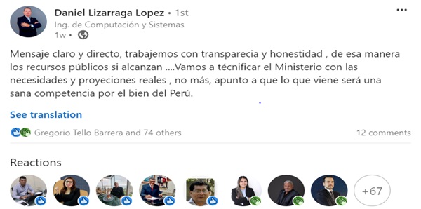 “Que sea un mensaje claro y directo, trabajemos con transparencia y honestidad, de esa manera los recursos públicos si alcanzan, vamos a tecnificar la institución con las necesidades y proyecciones reales, apunto que lo que viene será una sana competencia por el bien del Perú” textuales del Ing. Daniel Lizárraga, CIO recién incorporado al Ministerio Público – Fiscalía de la Nación, encontrado en una red social. Los que lo conocen, afirman que no le temblará la mano para poner orden en la institución, por lo pronto ya canceló un proyecto TI de más de cien millones de soles y separó a varios funcionarios involucrados en las negociaciones y lo convocará nuevamente con reglas donde se participe en igualdad de condiciones.