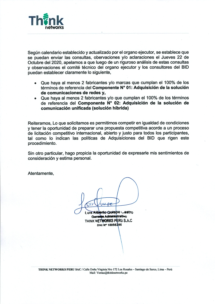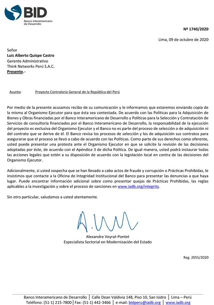 A continuación, publicamos la carta emitida por el Banco Interamericano de Desarrollo poniendo los puntos sobre las íes y donde hace recomendaciones en caso se sospeche alguna irregularidad, por otro lado, Luis Quispe, funcionario de Think Networks nos remite una carta señalando su preocupación por el aparente direccionamiento del proceso. Las cartas sobre la mesa.