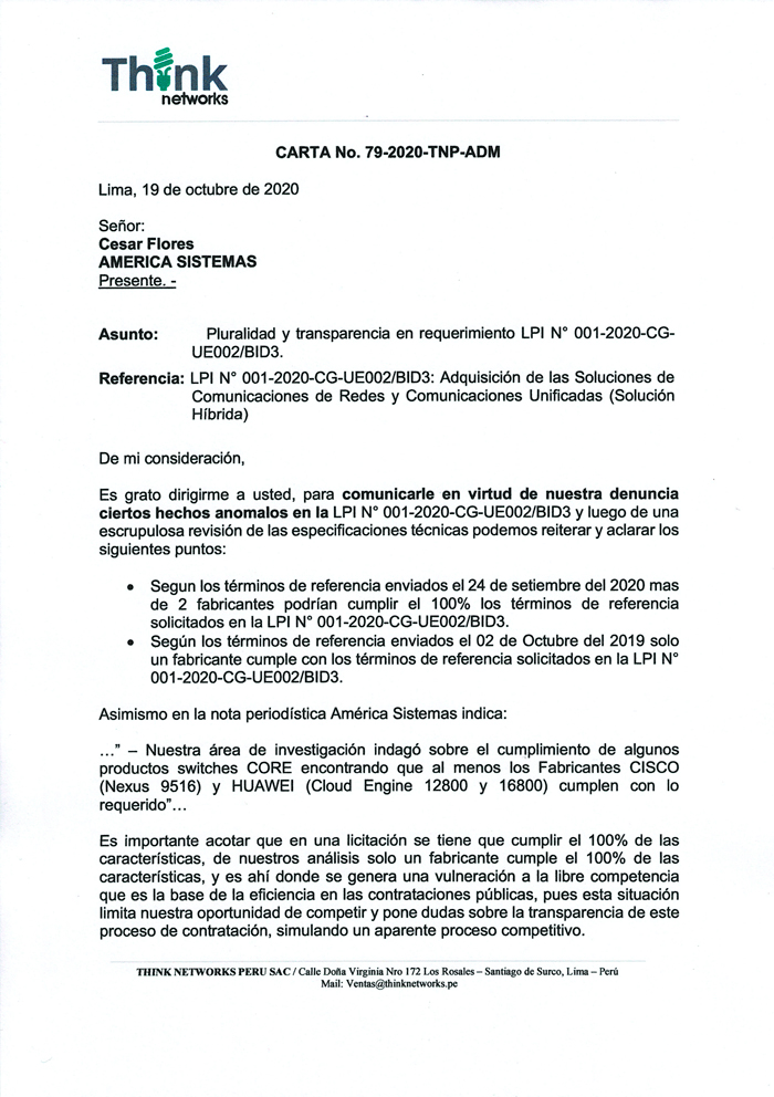 Estoy de acuerdo en que se haga una investigación, ya que por lo expuesto se ve un direccionamiento claro para que sólo puedan participar 2 fabricantes como Cisco y Huawei. Es propicio comentar que, por un tema de transparencia se pueda aperturar los TDR para que otras marcas puedan participar, pero me parece indignante que la empresa Think Network esté hablando de transparencia, cuando en el mercado de TI, tiene muchas cosas NO transparentes en anteriores procesos, asimismo, les pediría puedan consultarle a su gerente Luis Quispe a cuantos proveedores les adeuda hace más de 1 año varias pagos que ascienden a mas de $100,000, quisiéramos que ustedes como periodistas investiguen las deudas que actualmente tiene esta empresa y perjudica a empresas que confiaron en él, otorgándole crédito , no contesta mensajes ni llamadas.