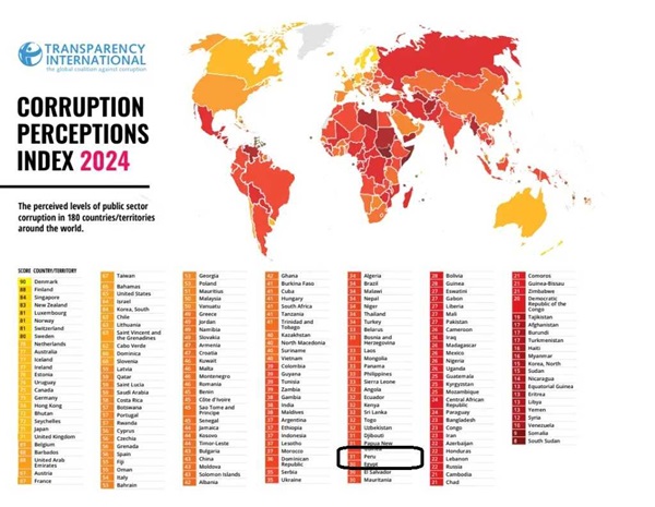 (americasistemas.com.pe. Lima, Perú – 26 de febrero 2025) El reciente Índice de Percepción de la Corrupción (IPC) 2024, publicado por Transparencia Internacional, ofrece una visión detallada de cómo la corrupción afecta a 180 países en todo el mundo. Este índice, que se basa en la percepción de la corrupción en el sector público, es una herramienta fundamental para entender los desafíos que enfrentan las naciones en materia de transparencia y gobernanza. En esta edición, Uruguay destaca como el país latinoamericano mejor posicionado, ocupando el puesto 13 con una puntuación de 76 sobre 100. Sin embargo, el foco de la presente nota periodística se centra en Perú, un país que, a pesar de algunos avances, sigue lidiando con niveles significativos de corrupción que afectan su desarrollo económico y social.