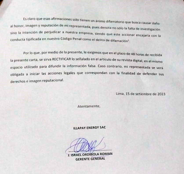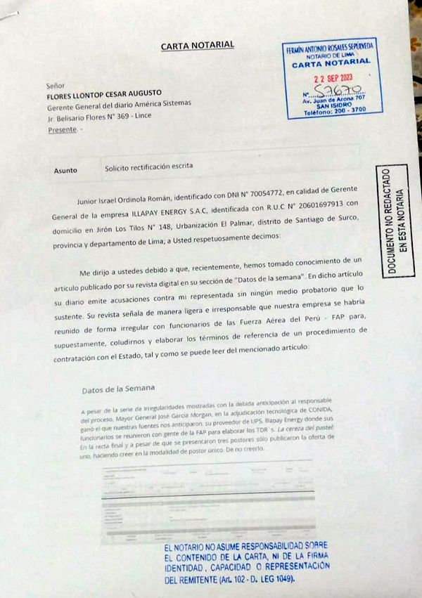 Recibimos de parte del sr. Junior Ordinola, representante de Illapay, ganadora del proceso de los contenedores en CONIDA una carta notarial donde su único argumento es que nunca se reunieron con empleados de la institución para elaborar los TDR´s tal a nuestra alerta. En aras de la libertad de expresión, cumplimos con publicar su contundente descargo.