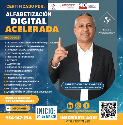 Comunicamos que el Dr. Ernesto Cuadros impartirá un didáctico curso intensivo de Pensamiento Computacional el 4 de marzo, enfocado en enseñar los fundamentos de la ciencia de la computación aplicados a cualquier área profesional. Inspirado en programas de universidades como Stanford y MIT, el curso cubre temas como IA, algoritmos, redes y bases de datos. Su objetivo es que los participantes comprendan las tecnologías que usan diariamente, sus riesgos y ventajas, preparándolos para un mundo laboral en transformación. El curso promueve la alfabetización digital como una competencia esencial en la era tecnológica.