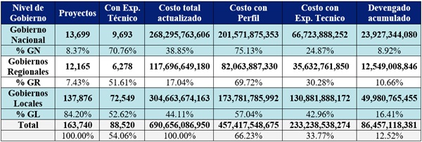 - Si consideramos un costo de 0.75% por la elaboración de perfiles se habría gastado S/ 5,179,920,652 y si consideramos 2.5% por la elaboración de Expedientes Técnicos se habría invertido S/ 5,830,963,457; es decir, más de S/ 11 mil millones entre perfiles y