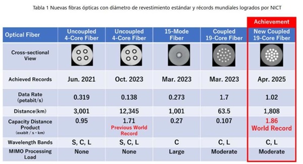 (americasistemas.com.pe. Lima, Perú – 06 de agosto 2025) Un récord sin precedentes acaba de establecer Japón en el mundo de las telecomunicaciones: una velocidad de transmisión de 1,02 petabits por segundo (Pbps) —equivalente a más de un millón de gigabits por segundo— alcanzada a lo largo de 1.808 km de fibra óptica. Esta hazaña fue posible gracias a una fibra de 19 núcleos desarrollada por el Instituto Nacional de Tecnologías de la Información y las Comunicaciones (NICT) y Sumitomo Electric, lo que permite multiplicar la capacidad sin modificar el diámetro estándar de los cables ya desplegados globalmente.