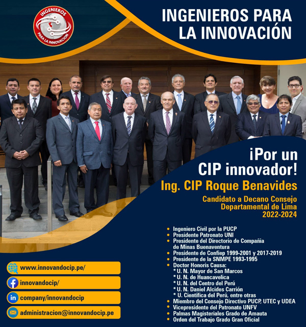Frente al clamor de una multitud de profesionales miembros del Colegio de Ingenieros del Perú (CIP) que en medio de toda la coyuntura que vivimos vienen pidiendo los necesarios cambios en la casa que los reúne, Roque Benavides Ganoza conocido hombre de empresa ha tomado el guante asumiendo el reto por la innovación en el CIP comenzando por el Consejo Departamental de Lima para el período 2022-2024. Para ello, ha sabido convocar a un destacado team que lo acompañará en las próximas elecciones.