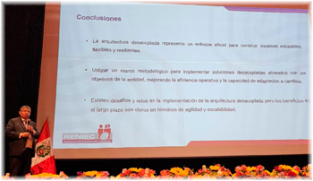 El Dr. Jaime Honores Coronado, CIO del RENIEC, destacó en la Conferencia “Transformación Digital: Arquitectura Digital en el Estado Peruano” con su exposición sobre la implementación de una arquitectura desacoplada en el Sistema Integrado de Identificación y Registro Civil (SIIRC). Este enfoque moderno reemplazará a mediano plazo la rigidez de los sistemas monolíticos, permitiendo mayor flexibilidad, escalabilidad y resiliencia. Honores resaltó los beneficios: adaptación ágil a cambios, eficiencia operativa y mejora en la interoperabilidad entre entidades del Estado. “La transformación digital no es un lujo, es nuestra responsabilidad,” enfatizó.