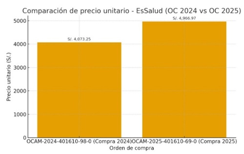 Los números no mienten. La gráfica comparativa muestra la disparidad de precios entre 2024 y 2025. Una barra azul (S/. 4,073.25) frente a otra más alta (S/. 4,966.97). Lo que debería ser economía de escala —comprar más para pagar menos— terminó en lo contrario: a mayor volumen, mayor precio.