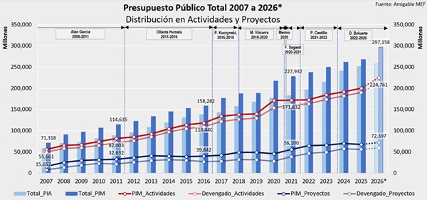 El siguiente gráfico ilustra la evolución del presupuesto público desde 2007 hasta 2026 (proyectado) y los periodos presidenciales de nuestro país. Las barras verticales comparan el PIA versus el PIM anual, la línea roja representa el presupuesto de actividades (gasto corriente) y la línea azul el presupuesto de proyectos de inversión.