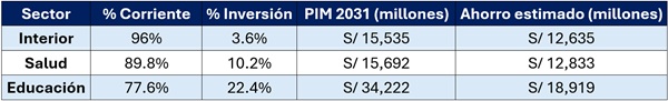 Si entre 2026 y 2031 el gasto corriente se mantiene constante y todo incremento presupuestal se canaliza únicamente hacia proyectos de inversión, se generaría un ahorro potencial de S/ 263,237 millones. Estos recursos permitirían reducir de manera sustancial las brechas en salud, educación, transporte y saneamiento. El cálculo, basado en la tendencia de los últimos 20 años y en la tasa de crecimiento promedio anual del PIM total (5.49%), confirma un monto significativo, suficiente para financiar el cierre de brechas estructurales en el país.