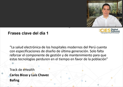 Por su lado, Carlos Bisso, presidente del directorio y Luis Chávez, jefe de proyectos de Infraestructura, ambos de Bafing llevaron la conferencia “Retos de la Salud Electrónica Peruana en la era del Covid -19” sentenciando que la salud electrónica de los hospitales modernos del Perú, cuentan con especificaciones de diseño de última generación. Sólo falta reforzar el componente de gestión y de mantenimiento para que estas tecnologías perduren en el tiempo en favor de la población y por ende de los más necesitados.