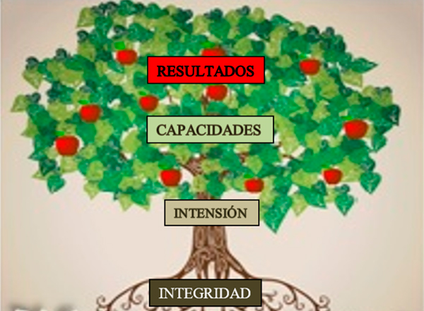 Un ejemplo para entender mejor las 4 dimensiones puede ser con la metáfora de un árbol, la Integridad esta debajo de la superficie, son las raíces que hacen posible el crecimiento de los otros tres, la Intención es el tronco que es más visible y nos lleva a la superficie, las Capacidades son las ramas y los Resultados son los frutos que son tangibles, medibles y evaluados por otros.