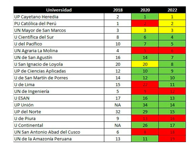 Ranking de excelencia de la SUNEDU donde muestran la evolución de las universidades peruanas en los años 2018, 2020 y 2022. El caso de la pública UNI es preocupante, mientras que la particular Piura desciende. Gráfico elocuente.
