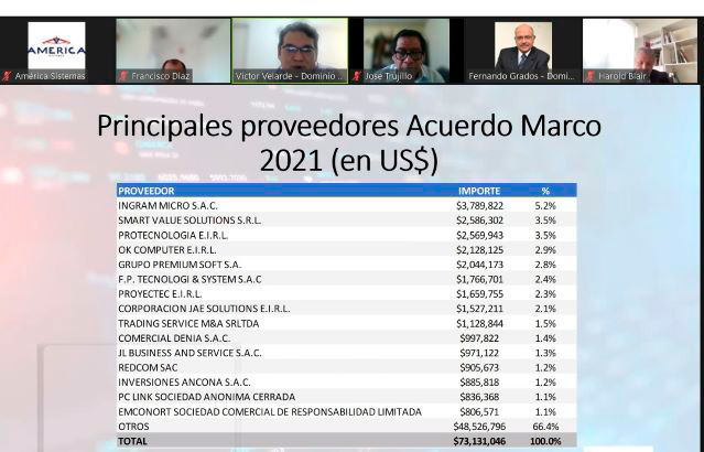 En cambio, en los tres primeros trimestres del 2021, la participación de marcas de computadoras, vía Acuerdo Marco, es como sigue: computadoras de escritorio (HP, 41,4 %; Lenovo, 20,4 %; Dell, 20,3 % y otras, 18,0 %) y portátiles (Lenovo, 38,1 %, Dell, 31,4 %; HP, 30, 2 %).