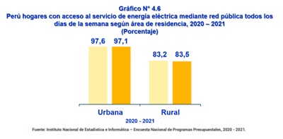 Hoy en día, la electricidad es una variable de desarrollo que los países industrializados alcanzan al 100% de hogares. Sin embargo, en Perú no se logra aún el 100% de disponibilidad de energía eléctrica en los hogares, y en Tumbes, la zona urbana alcanza solo el 92,8%, siendo la región con menor desarrollo eléctrico. De otro lado, en la zona rural, Ucayali solo logra el 51,9%; y Ancash logra el 94,1%, siendo la región con mayor electrificación en zonas rurales.