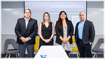En el conversatorio participó Ofelia Soriano Ramos, directora de la DPNTRA. El panel estuvo formado por Raúl Díaz, gerente general de Lima Expresa; Richard Arce, CEO de Vía Plus, empresa de Sistemas de Transportes Inteligentes de Vinci Highways; y Carolina Palacios, presidenta de BCW en Sudamérica; quienes dialogaron sobre el interés que existe por parte del sector privado para implementar el telepeaje en Perú.