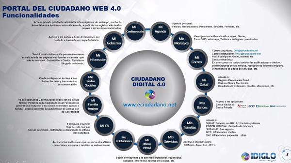 Entre otras funcionalidades se tendrá gmail, hotmail, casilla electrónica, correo ciudadano, correo institucional, en donde se recibe también las notificaciones y alertas, confirmaciones de cita médica, recepción de informes médicos, vencimientos de pagos de servicios, etc. Se podrá tener acceso a registro personal de salud, historia clínica electrónica, resultado de exámenes, recetas, atenciones, entre otros. El ciudadano también podrá tener acceso a Sunat, generar sus RR HH, facturas y demás.