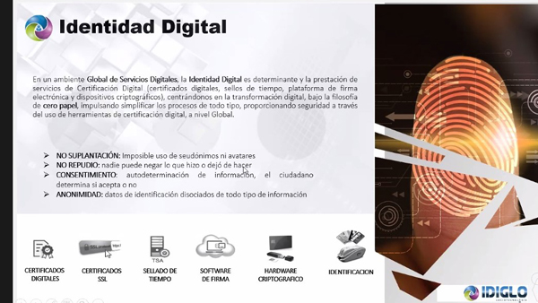 Señala que en un ambiente Global de Servicios Digitales la Identidad Digital es determinante y la prestación de servicios de Certificación Digital (certificados digitales, sellos de tiempo, plataforma de firma electrónica y dispositivos criptográficos), centrándonos en la transformación digital, bajo la filosofía de cero papel impulsando simplificar los procesos de todo tipo, proporcionando seguridad a través del uso de herramientas de certificación digital, a nivel global.