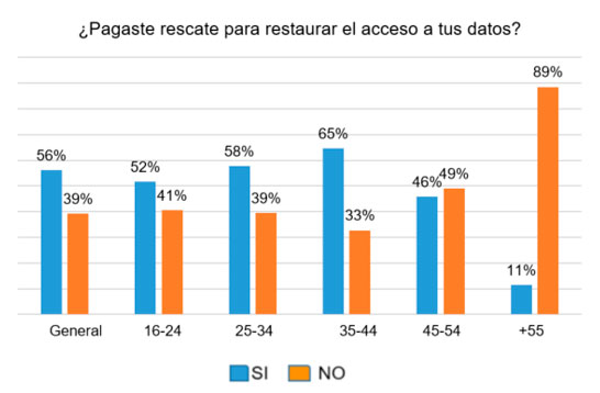 Casos de pago de rescate entre usuarios que experimentaron una infección de ransomware a nivel global, por rango de edad