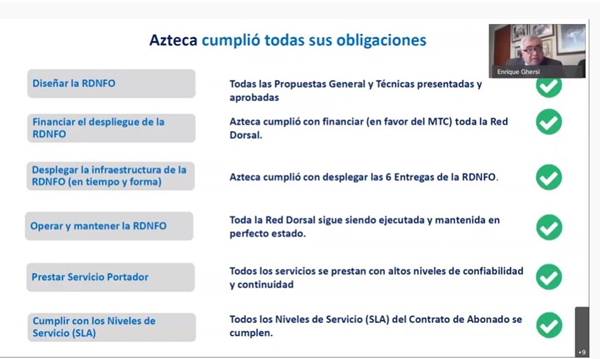 En tanto, Enrique Ghersi, abogado de Azteca, anotó que los objetivos del proyecto de la red nacional de fibra óptica están referidos a impulsar y masificar el uso de la banda ancha, favorecer a la población el su desarrollo socioeconómico, avanzar hacia el gobierno electrónico, y viabilizar y goce de los derechos fundamentales salud, educación y seguridad. Anotó que la concesionaria cumplió con sus obligaciones como son financiar en favor del MTC toda la red dorsal, con desplegar las 6 entregas de la red, sigue siendo ejecutada y mantenida en perfecto estado, todos los servicios que se prestan son de altos niveles de confiabilidad y todos los niveles de servicio del contrato de abonado se vienen cumpliendo.