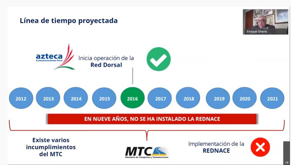 Resaltó que el problema de la red dorsal no puede ser utilizado por nadie porque no existe una red nacional del estado que permita como una plataforma de servicio, por ello ningún estatal usa la red dorsal. “Este cuello de botella es de responsabilidad del Estado por no llevar a cabo la constitución de su red, no existe esa plataforma de conexión por ello muchas entidades contratan los servicios de operadores privados. Ante esta problemática se trató de buscar una solución pero la resolución de ella va empeorar esta situación, porque el nuevo concesionario tampoco podría proveer la REDNACE que no existe”.