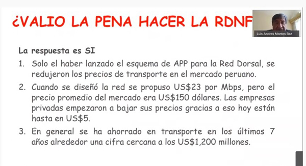 Por su parte el Ing. Rafael Gold dijo que la Red Dorsal Nacional de Fibra Óptica (RDNFO) tuvo una inversión de 322 millones de dólares, está compuesto por 322 nodos de interconexión, tiene un centro de operaciones en Lima, un punto de presencia en Lurín, 180 nodos de distribución en capitales de provincia y 123 nodos de distribución en diversas localidades, las cuales ni siquiera llega a los distritos.