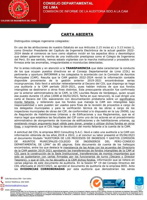 El 17 de julio de 2024, el Ingeniero Francisco Madrid Cisneros, Director Presidente del Capítulo de Ingeniería Electrónica y Presidente de la Comisión encargada de investigar estos hechos, publicó una carta abierta dirigida a los ingenieros colegiados, en la que detalla las irregularidades encontradas en el manejo de los fondos de la Comisión de Asuntos Municipales (CAM) durante la mencionada gestión.